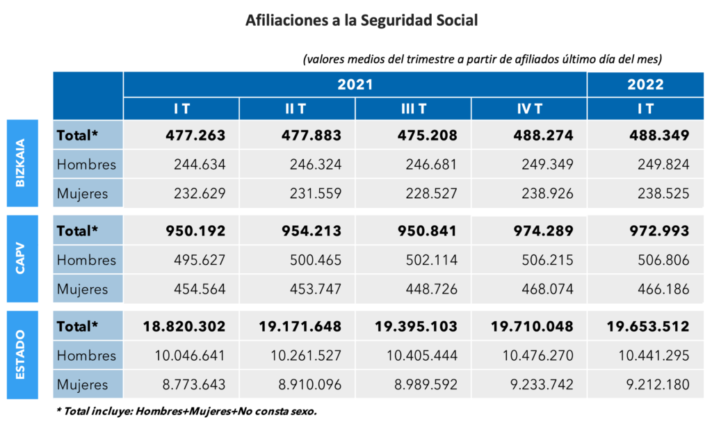 El incremento o descenso en el número de afiliaciones respecto al último trimestre del año 2021 ha sido de 74,7, -1295,7 y -56.535,7 respectivamente en Bizkaia, la CAPV y a nivel estatal.