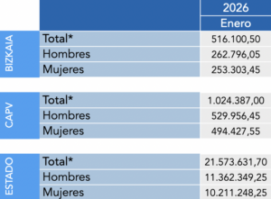 En enero de 2026, la afiliación a la Seguridad Social se situó en 516.100,5 personas en Bizkaia, de las que 262.796,1 fueron hombres y 253.303,5 mujeres. En el conjunto de la CAPV, la afiliación alcanzó las 1.024.387 personas, mientras que en el Estado se situó en 21.573.631,7.