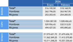 En febrero de 2026, la afiliación a la Seguridad Social alcanzó en Bizkaia las 518.168,95 personas, lo que supone un incremento de 2.068,45 afiliaciones respecto a enero. Del total, 263.967,90 correspondieron a hombres y 254.200,05 a mujeres, con aumentos mensuales en ambos casos. En el conjunto de la EAE, la afiliación se situó en 1.028.406,65 personas, es decir, 4.019,65 más que en enero. En el Estado, la cifra total ascendió a 21.670.636,10 personas afiliadas, lo que representa un aumento de 97.004,40 respecto al mes anterior. En conjunto, los datos de febrero reflejan una evolución positiva de la afiliación, tanto en Bizkaia como en los ámbitos autonómico y estatal.