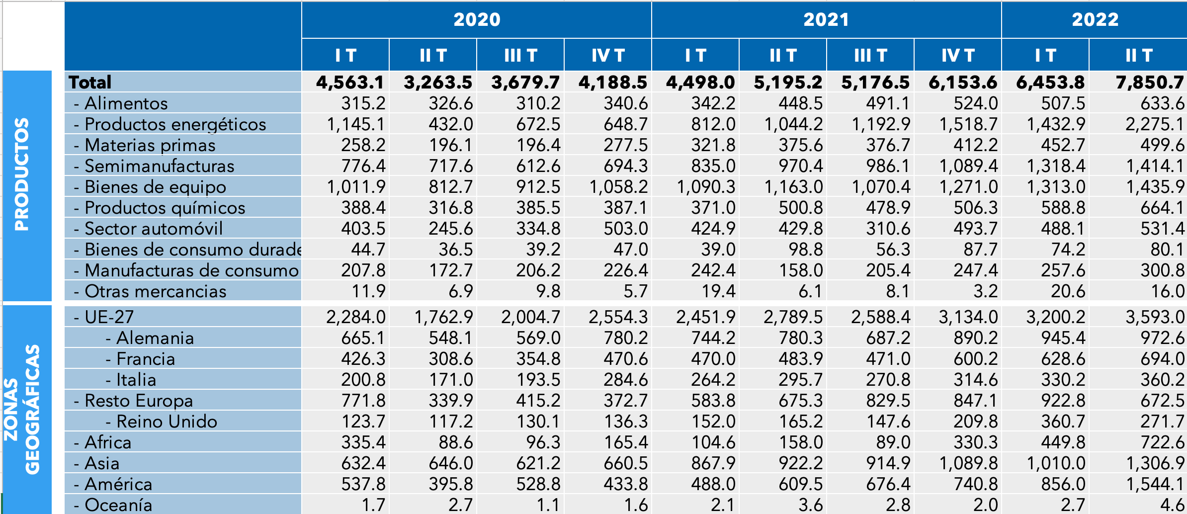 Aumenta considerablemente la cifra total de importaciones en el conjunto de la Comunidad Autónoma Vasca durante el segundo trimestre del 2022, situándose en máximos de la serie temporal analizada según datos publicados por Datacomex.