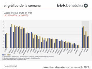 Entre 2014 y 2024, la intensidad de I+D aumentó en 19 países de la UE, registrándose los mayores incrementos en Bélgica (+1,0 pp), Grecia (+0,7 pp) y Estonia y Croacia (+0,6 pp cada uno).