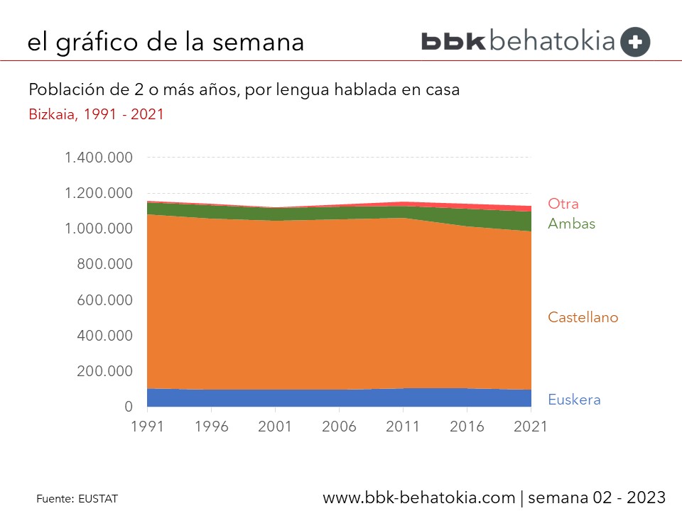 Una de las variables actualizadas es la que mide el conocimiento y el uso de las diferentes lenguas en Euskadi, con datos desagregados por Territorios Históricos y Comarcas. Como puede apreciarse, la población mayor de 2 años de Bizkaia que utiliza de manera habitual el euskera en casa se ha mantenido estable en los últimos años (en torno a las 100.000 personas), mientras han crecido los hogares en los que se usan el castellano y el euskera (especialmente esta última década, que ha pasado de 70.000 a 113.000). La lengua que se usa mayoritariamente en los hogares es el castellano (en torno a 900.000 personas), mientras que es reducido el uso de otras lenguas (aunque han pasado de 6.000 a 32.000).