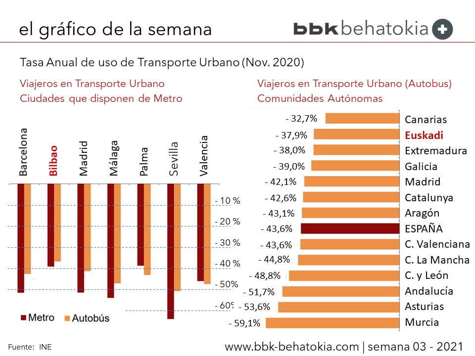 Entrando en detalle en el transporte urbano, es utilizado por más de 147,4 millones de viajeros en noviembre, un 46,5% menos que en el mismo mes del año 2019. El transporte por metro disminuye un 50,5% en tasa anual. El metro de Sevilla presenta el mayor descenso (−63,9%) y el de Palma el menor (−38,7%). Entre las ciudades que poseen metro, la mayor bajada en el transporte por autobús se registra en Sevilla (−50,7%) y la menor en Bilbao (−36,7%).