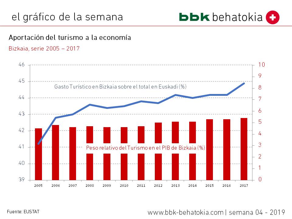 En Bizkaia este sector sigue al alza. Sigue creciendo su peso en el PIB (llega ya al 5,4%) y también su peso en el total del Gasto Turístico en Euskadi (casi el 45%, con una subida de 4 puntos porcentuales en una década).