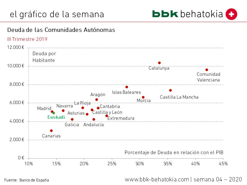 Euskadi y Navarra aparecen entre las menos endeudadas, en las dos categorías, especialmente en la de Deuda en relación al PIB.