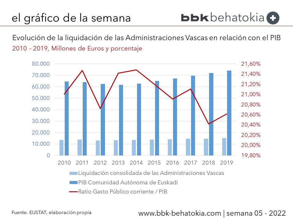 La evolución del gasto corriente del conjunto de las Administraciones Vascas en la última década muestra una correlación bastante alta con el PIB de la Comunidad Autónoma. Como puede apreciarse en el gráfico (color rojo, eje de la derecha), se ha mantenido en la estrecha banda entre el 20,4% y el 21,5%.
