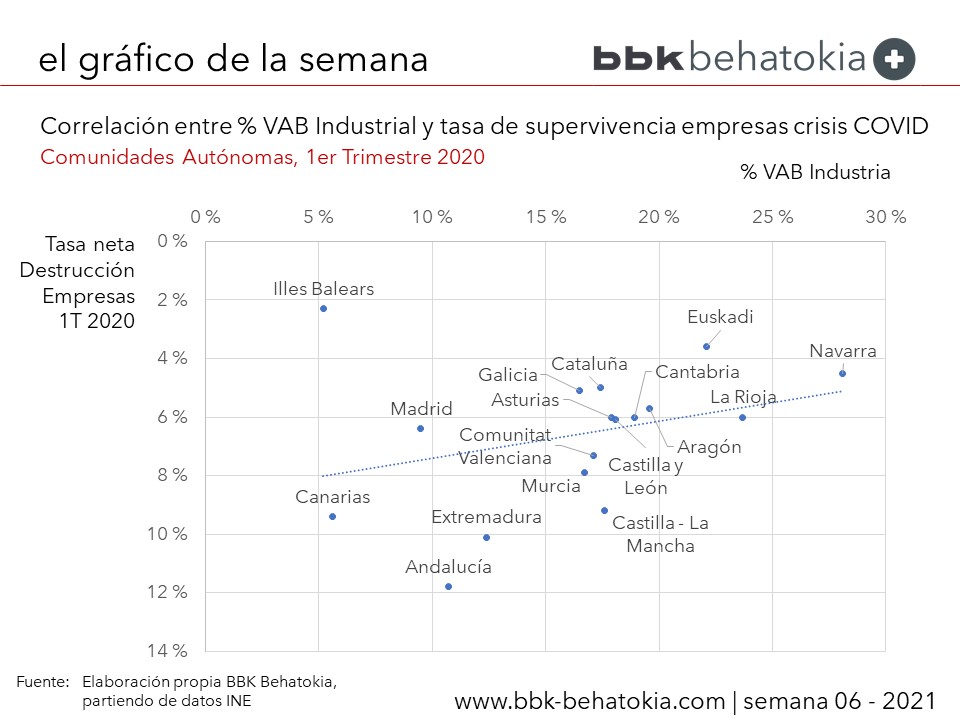 Uno de los parámetros analizados es el dinamismo de las unidades empleadoras en el primer trimestre de 2020, que fue el más relevante en términos de pérdidas de efectivos, por Comunidades Autónomas. Cruzando este dato con el último dato de porcentaje de VAB industrial, se obtiene la correlación que recoge el Gráfico de esta semana.