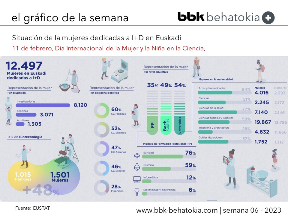el objetivo de visibilizar la presencia de la mujer en el mundo de la Ciencia y, por eso BBK Behatokia quiere hacerse eco de la completa infografía elaborada Eustat- Instituto Vasco de Estadística. A través de sus datos, analiza la participación de la mujer en este ámbito, tanto en el campo laboral como en la enseñanza secundaria y universitaria.