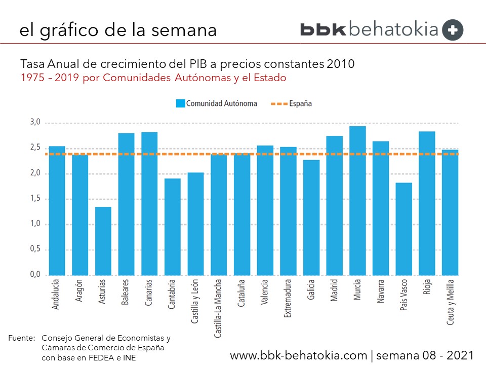 El crecimiento medio del conjunto del Estado en el periodo ha sido del 2,39%, pasando en euros constantes de 2010 de 414.147.237 miles de euros en 1975 a 1.168.572.320 miles de euros en 2019. Por encima de este crecimiento, se sitúan en las tres primeras posiciones y por este orden, Murcia, La Rioja y Canarias con diferenciales que superan los 0,4 puntos porcentuales.