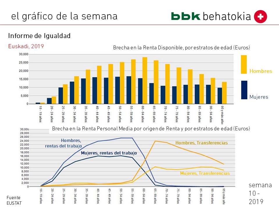 Las diferencias se acentúan con la edad, especialmente con la edad de jubilación, momento en que la renta disponible de las mujeres es menos de la mitad que la de los hombres. Esta situación se aprecia hasta los 79 años, cuando las cifras de mujeres y hombres comienzan a aproximarse, sin llegar a igualarse en ningún momento.