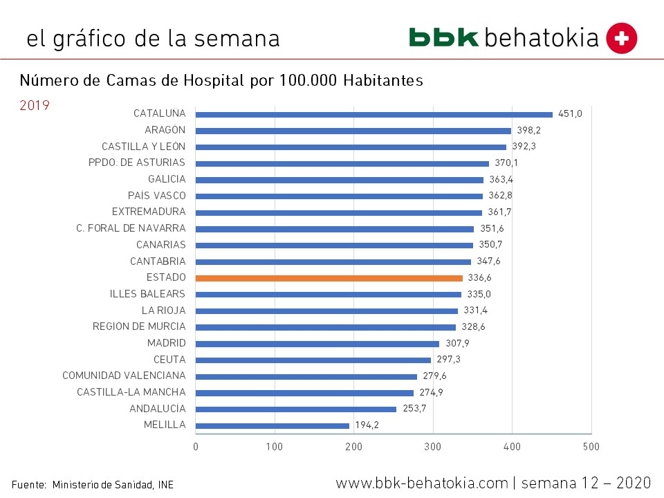 Cruzando los últimos datos disponibles de esta estadística, con los datos más recientes de población publicados por INE, es posible obtener los últimos datos disponibles de número de camas de hospital por 100.000 habitantes, en las diferentes Comunidades Autónomas.