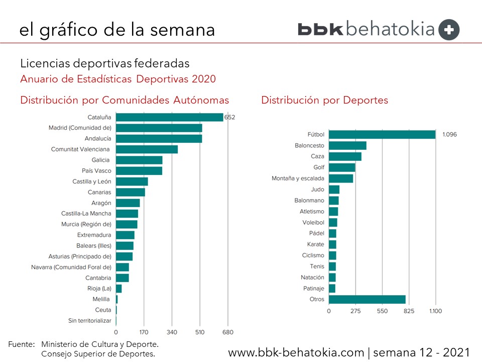 El Ministerio de Cultura y Deporte publica anualmente el Anuario de Estadísticas Deportivas, que recoge éstos y otros interesantes datos sobre el deporte y su impacto en la economía y en la sociedad. En el último Anuario publicado, correspondiente al año 2020, en Euskadi había 206.406 hombres y 74.524 mujeres (en total 263.848 personas federadas en los diferentes deportes).