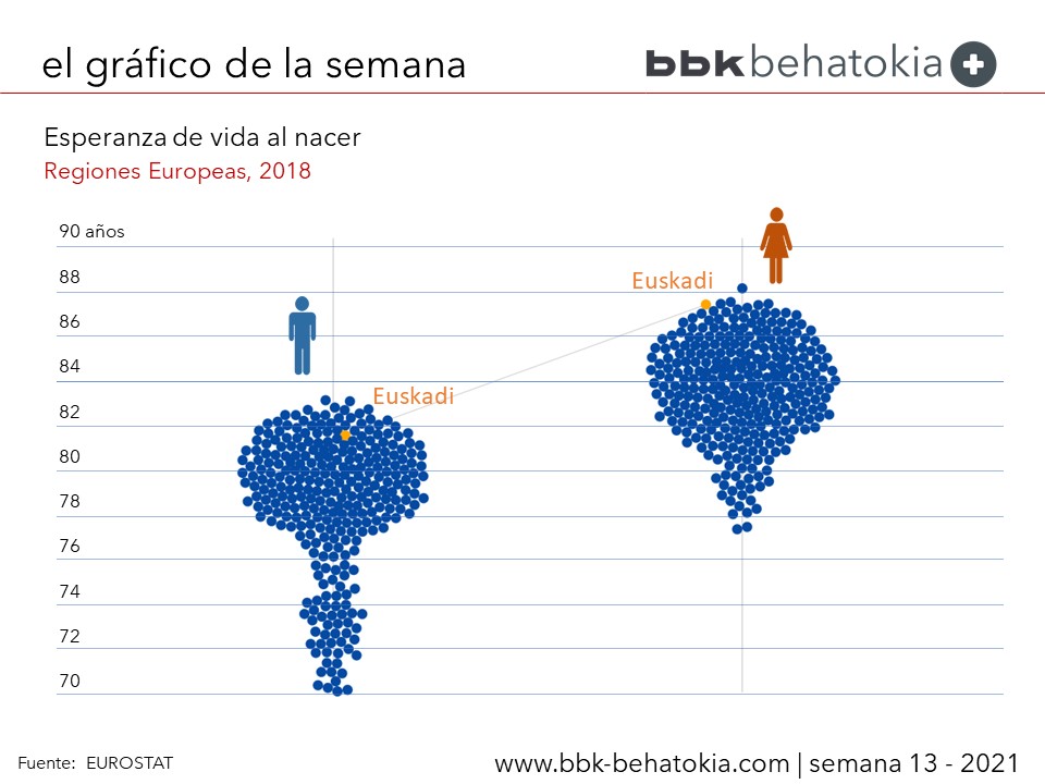 El gráfico permite apreciar que la esperanza de vida es mayor para las mujeres que para los hombres en todas las regiones de la UE. Euskadi se sitúa en ambos casos entre las regiones con mayor esperanza de vida en Europa, los hombres con una esperanza próxima a los 82 años, y las mujeres a los 88 años.