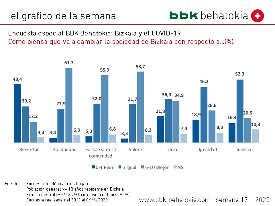 A la pregunta de cómo piensa que va a cambiar la sociedad de Bizkaia con respecto a diferentes factores, destaca el dato de que 1 de cada 2 personas residentes en Bizkaia piensa que la crisis del coronavirus va a suponer un empeoramiento del bienestar en la sociedad. La buen noticia es que prácticamente el 60% afirma que mejoraremos en Solidaridad, Fortaleza de la Comunidad y Valores, y el 50% en Justicia e Igualdad.