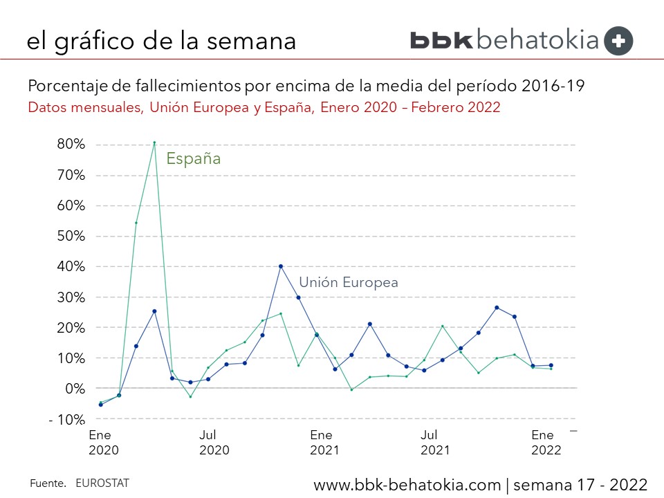EUROSTAT ha actualizado la estadística que ha decantado como la más relevante para entender el impacto de la pandemia. Es la que compara el número de fallecimientos registrados en las sucesivas olas, comparadas con el mismo período en los años previos al estallido de la crisis (2016 – 2019).