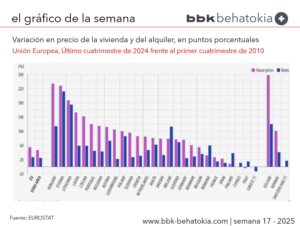 Entre 2010 y el cuarto trimestre de 2024, los precios de la vivienda en la UE aumentaron un 55,4% y los alquileres un 26,7%. Mientras que los alquileres han aumentado de forma constante, los precios de la vivienda han seguido un patrón más variable, mostrando un aumento asombroso entre el primer trimestre de 2015 y el tercer trimestre de 2022, seguido de una pequeña caída y estabilización, antes de volver a aumentar en 2024.
