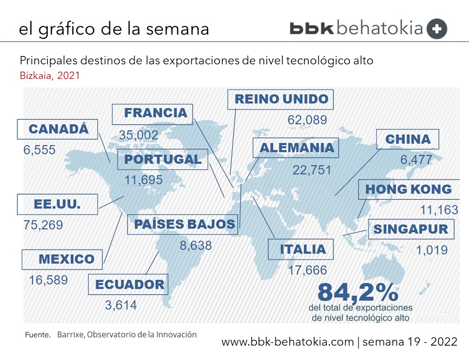 También resulta conocer los países que son los principales destinos de las exportaciones de alta tecnología de las empresas de Bizkaia.