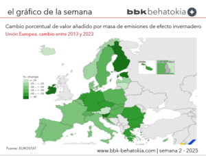 La intensidad de las emisiones de gases de efecto invernadero mide la cantidad de emisiones (medidas en equivalentes de CO2) por unidad de valor añadido bruto (medido en euros) en una economía determinada. Una disminución de la intensidad de las emisiones significa menos emisiones por la misma cantidad de valor económico añadido.