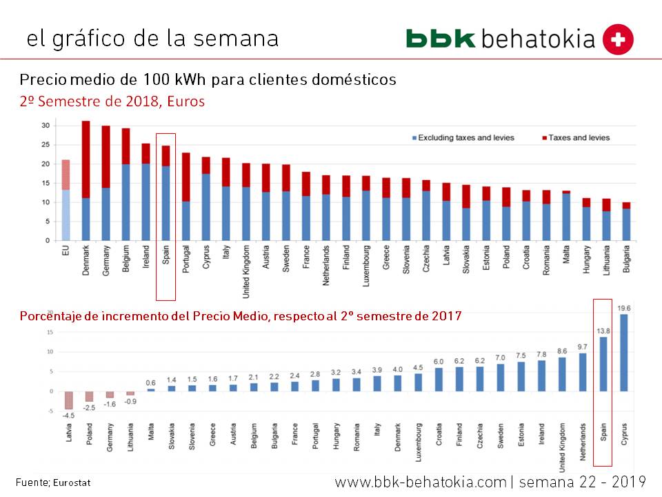 Según los datos publicados esta semana por Eurostat, en los Estados miembros de la UE, el mayor incremento en los precios de la electricidad de los hogares entre 2018 y 2017 se registraron en Chipre (+ 19,6%), seguidas por España. (+ 13.8%), Holanda (+ 9.7%), Reino Unido (+ 8.6%), Irlanda (+ 7.8%) y Estonia (+ 7.5%). Solo se observaron disminuciones en cuatro países: Letonia (-4,5%) seguida de Polonia (-2,5%), Alemania (-1,6%) y Lituania (-0,9%).