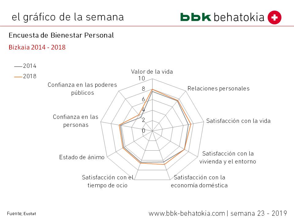 Eustat ha actualizado la Encuesta de Bienestar Personal, que ofrece información sobre la percepción subjetiva del bienestar de la población. La población de Bizkaia puntúa con un 7,5 su satisfacción con la vida en general en 2018 en una escala de cero a diez, mejorando en cinco décimas desde 2014, que obtuvo una nota de un 7,0, y manteniendo el mismo valor obtenido en 2017.