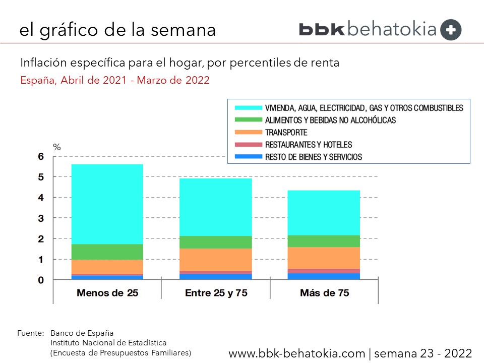 En el análisis de la inflación, ha presentado el desigual impacto que está teniendo la subida de precios en los hogares, en función de su nivel de renta, tomando como referencia la Encuesta de Presupuestos Familiares que desarrolla el INE. Los datos muestran que, en los últimos meses, los hogares con menor renta han sufrido una inflación superior como consecuencia de que, entre estos hogares, tiene un mayor peso el gasto en bienes de primera necesidad, que son los que han mostrado un mayor encarecimiento relativo recientemente.