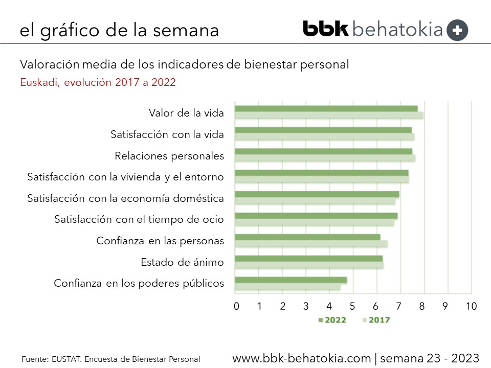 EUSTAT ha facilitado esta semana los últimos datos de la Encuesta de Bienestar Personal, que ofrece información detallada sobre la percepción del bienestar de la población de 16 y más años residente en viviendas familiares, a través de una serie de preguntas que miden preferentemente aspectos de la calidad de vida diferentes de la dimensión material.