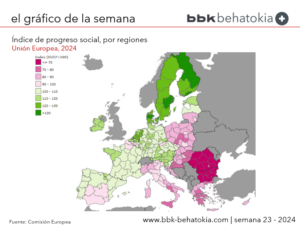 Euskadi es la primera región del Estado, y la 44 a nivel europeo sobre un total de 236, en progreso social según los resultados ofrecidos en la reciente edición del EU Social Progress Index. Esta herramienta está desarrollada por la Comisión Europea como una herramienta para facilitar la comparación entre regiones de la UE en una amplia gama de criterios, ayudando a los responsables políticos y partes interesadas a evaluar los puntos fuertes y débiles de una región en aspectos sociales y ambientales.