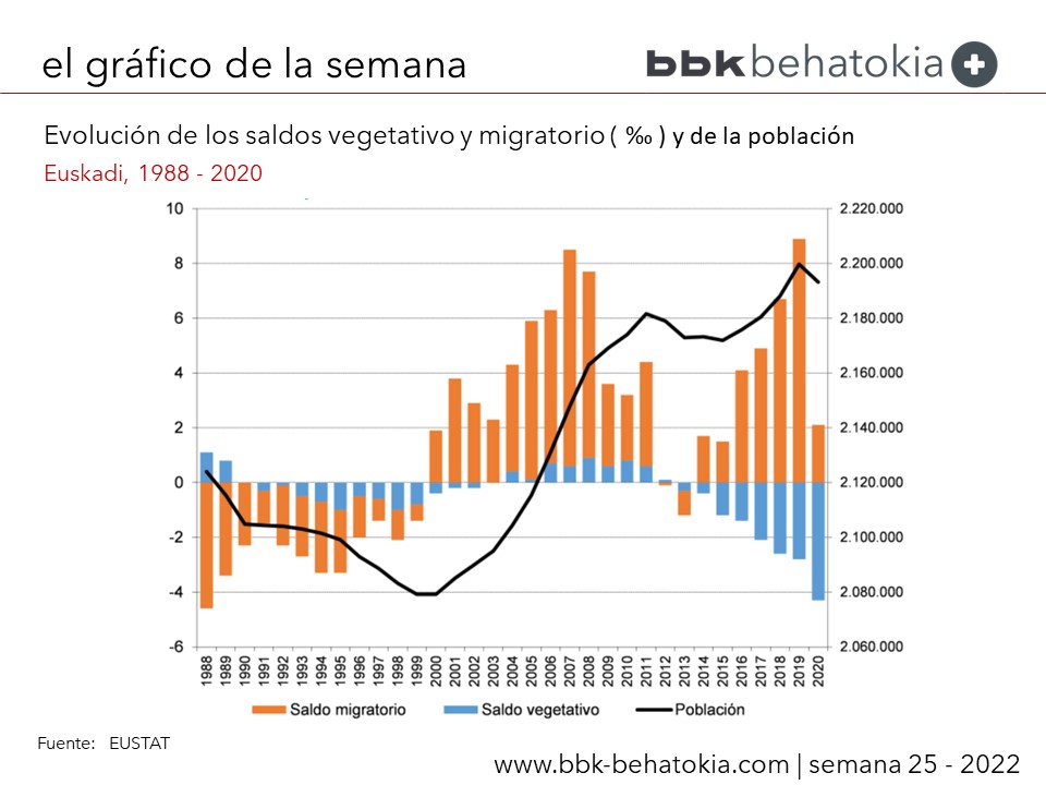 Entre otros análisis, destaca la evolución histórica de los saldos de nacimientos y muertes (saldo vegetativo) y el migratorio, que queda recogido de forma esquemática en el Gráfico de esta semana.