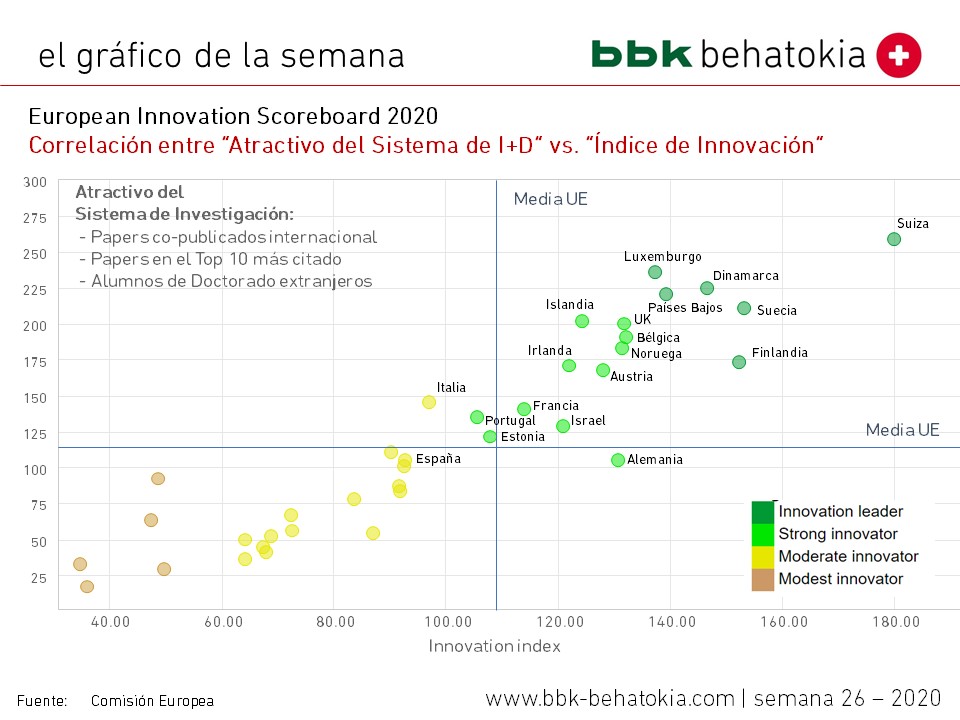 Junto con el Informe, existe una herramienta online que permite visualizar los datos y sus correlaciones. Eso permite comprobar, por ejemplo, la altísima correlación entre los indicadores asociados al atractivo internacional del sistema de I+D con el propio valor del Índice de Innovación.