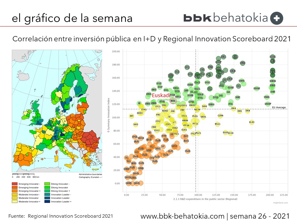 El Gráfico de esta semana muestra una de esas visualizaciones, que recoge en este caso la correlación entre el indicador «Gasto Público en I+D» y el indicador sintético RIS 2021. Se aprecia una alta correlación entre ambas variables.