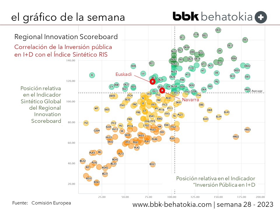 Una de las dimensiones que permite analizar es la correlación entre dos variables, o una de las variables y el indicador global sintético. El Gráfico de esta semana recoge, por ejemplo, la inversión pública en I+D y la posición en el conjunto de indicadores que sintetiza en RIS, en el que se ha destacado la posición de las Comunidades de Euskadi y Navarra.