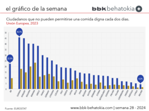 Además, si nos centramos en las personas en riesgo de pobreza, en 2023 la proporción a escala de la UE era del 22,3 %, lo que supone un aumento de 2,6 puntos porcentuales en comparación con 2022 (19,7 %). A nivel nacional, el mayor porcentaje de personas en riesgo de pobreza que no pueden permitirse una comida adecuada se registró en Eslovaquia (45,7 %), seguida de Hungría (44,9 %) y Bulgaria (40,2 %).
