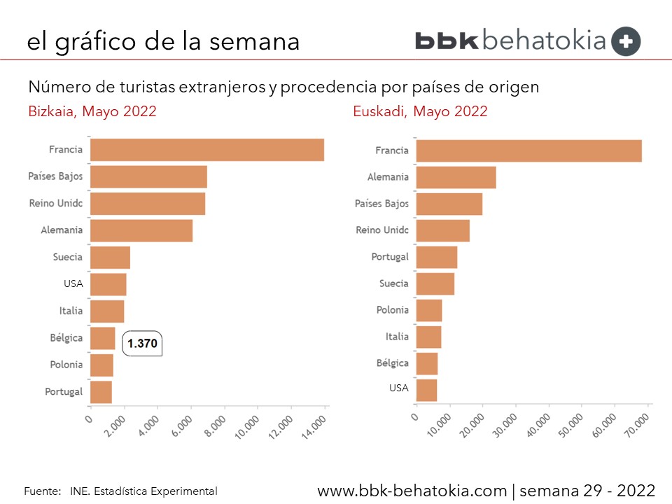 Los resultados para Bizkaia y Euskadi muestran una procedencia fundamentalmente europea, con Francia claramente destacada sobre el resto de países de origen.