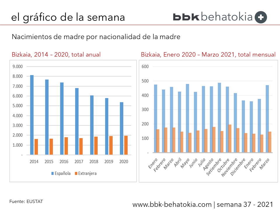 En el 25,7% de los nacimientos ocurridos en la C.A. de Euskadi durante los tres primeros meses del año 2021, la madre tenía nacionalidad extranjera, porcentaje 3,1 puntos porcentuales inferior al del mismo trimestre de 2020. En Álava la proporción de madres de nacionalidad extranjera alcanzó el 30,6%, frente al 25,3% de Bizkaia y al 23,7% de Gipuzkoa.