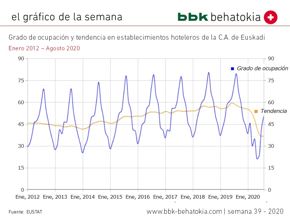 EUSTAT ha actualizado esta semana los datos de la Encuesta de Establecimientos Turísticos Receptores, con los datos hasta Agosto 2020.