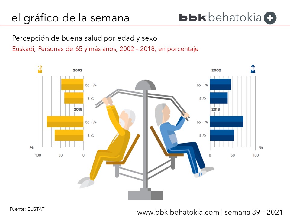 Uno de los indicadores recogidos en este documento es la percepción de buena salud (Encuesta de la salud, Gobierno Vasco). La percepción de buena salud indica que a mayor edad se percibe peor salud.