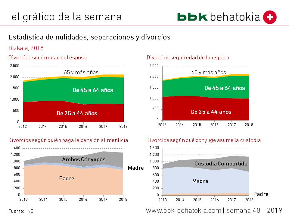 La mayor parte de los divorcios se produce en la franja de edad de 45 a 64 años. Va avanzando lentamente el equilibrio entre el papel de hombre y mujer en relación con el pago de la pensión alimenticia o la custodia compartida, aunque se mantienen todavía porcentajes claramente marcados hacia los roles tradicionales.