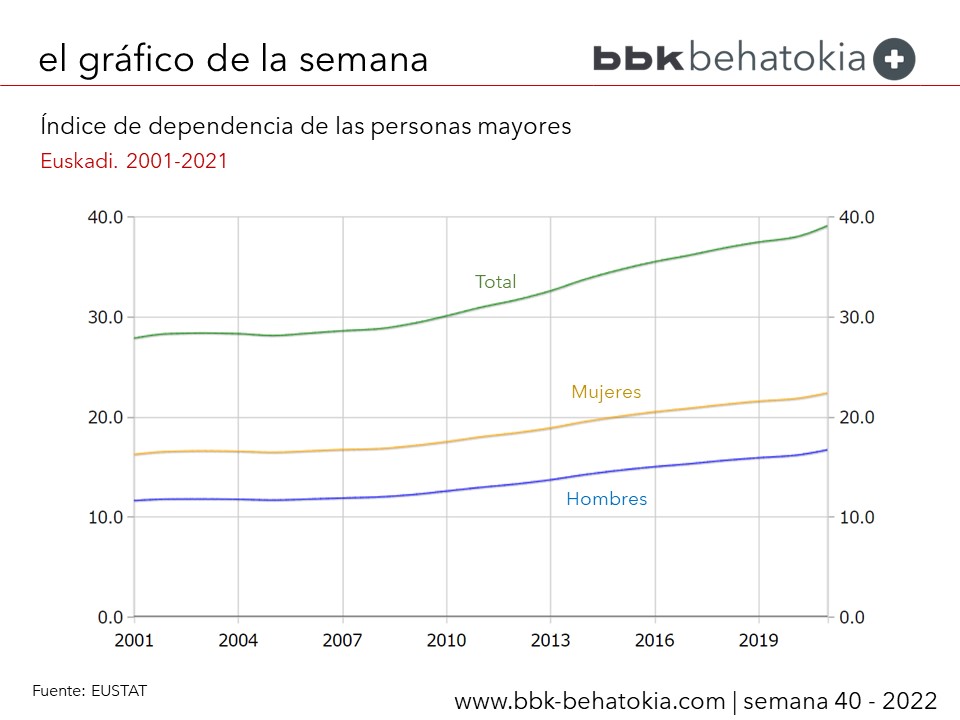 En 2021, el índice de dependencia de las personas mayores, medido como la población de 65 y más años (población “teóricamente” dependiente) respecto a la población de 20 a 64 años (población “potencialmente” productiva, activa o en edad de trabajar), se situó en 39,1 personas teóricamente dependientes por cada 100 en edad de trabajar.
