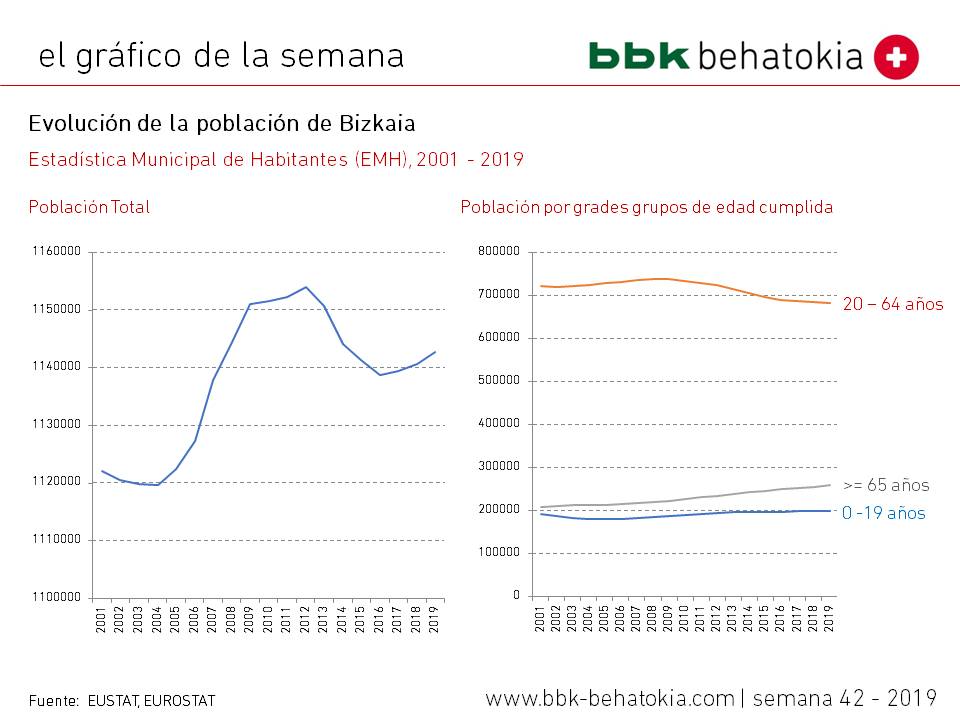 En 2019 Bizkaia, con el 22,7%, supera la proporción de población de 65 y más años que se da en Gipuzkoa (22,2 %), Araba (20,7 %), Euskadi (22,2%) y el conjunto del Estado (19,4%), aunque hay otras Comunidades Autónomas como el Principado de Asturias, Castilla y León y Galicia que tienen proporciones más elevadas, con porcentajes por encima del 25%.
