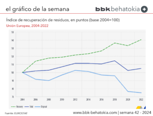 Mientras que la cantidad total de residuos tratados sólo aumentó ligeramente desde 2004 (+5%), la cantidad de residuos recuperados aumentó un 40,6% (de 870 millones de toneladas a 1 223 millones de toneladas). La recuperación incluye el reciclado, el relleno y la incineración con recuperación de energía. La cantidad de residuos sujetos a eliminación disminuyó de 1 027 millones de toneladas en 2004 a 769 millones de toneladas en 2022, un 25,1% menos.