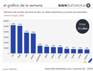 Entre 2022 y 2023, el porcentaje de noches pasadas por huéspedes internacionales procedentes de regiones no europeas aumentó del 12,6% al 15,6%. En cifras absolutas, las pernoctaciones de no europeos crecieron en 60 millones, es decir, 164.000 huéspedes extranjeros más cada noche del año, de media.