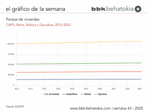 Por territorios, Bizkaia concentra el mayor volumen de viviendas, seguida de Gipuzkoa y Álava, que mantiene el nivel más bajo aunque con un crecimiento ligeramente superior en términos relativos. Esta evolución refleja tanto la dinámica demográfica y económica de cada territorio como las diferencias en disponibilidad de suelo y ritmo urbanizador.