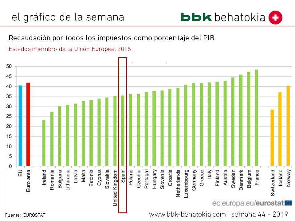 España, se encuentra en una posición intermedia, con un porcentaje del 35.4% en 2018, si bien en 2017 era inferior, del 34,7%, siguiendo la tendencia general de los estados europeos.