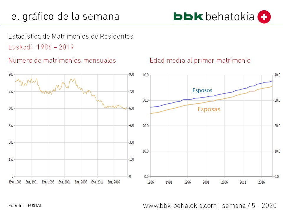 Eustat ha publicado esta semana la Estadística de Matrimonios, con datos actualizados a 2019. Si nos limitamos a los últimos 25 años, la edad media de los esposos y esposas ha aumentado en 8,1 años, manteniéndose estable la diferencia de 2 años entre ambos. La edad al matrimonio ha seguido aumentando en 2019, ya que los hombres solteros se casaron a los 37,7 años de media y las mujeres a los 35,7 años.