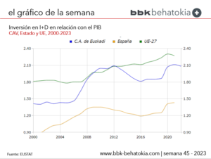 Bajando al detalle territorial, se constata que en 2022 el 45,6% del gasto total en I+D interna de la comunidad se llevó a cabo en Bizkaia, el 43,3% en Gipuzkoa y el 11,1% en Álava. En relación al PIB de cada territorio, hay que señalar que este gasto representa el 2,75% del de Gipuzkoa, el 1,83% del de Bizkaia y el 1,49% del de Álava.