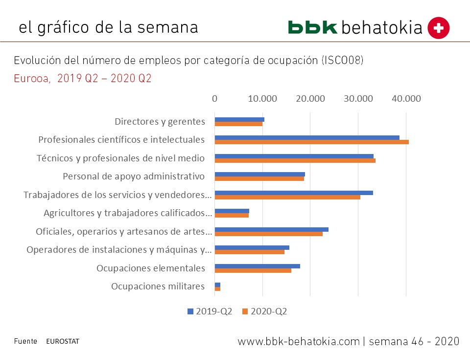 El empleo en la UE cayó un 2% en el segundo trimestre de 2020, desde los 200 millones del año anterior. Los descensos más pronunciados se referían a personas en ‘ocupaciones elementales’ (-10%), ‘trabajadores de servicios y ventas’ (-8%), ‘operadores y ensambladores de plantas y máquinas’ (-6%), ‘trabajadores de oficios y oficios afines’ ( -5%) y ‘directivos’ (-3%). Sin embargo, el número de personas empleadas como «profesionales» aumentó (+ 5%) al igual que, en menor medida, «técnicos y profesionales asociados» (+ 1%).