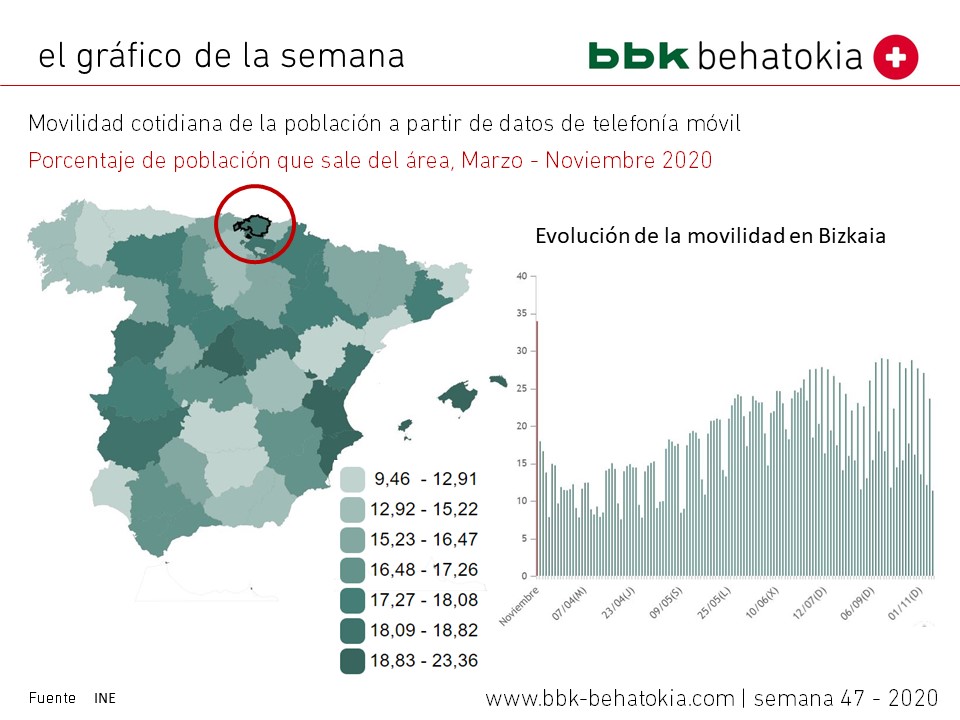 Bizkaia aparece como uno de los territorios con mayor porcentaje de movimiento entre áreas (las áreas son demarcaciones (municipales o comarcales en la mayoría de los casos, que superan en todos los casos 5.000 habitantes).