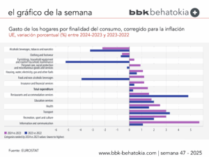 Entre las principales categorías, el gasto de los hogares en información y comunicación fue el que más aumentó (+5,7 %), seguido del ocio, el deporte y la cultura, y el transporte (ambos con un +3,0 %). El gasto en restaurantes y servicios de alojamiento siguió creciendo (+1,6 %), aunque a un ritmo notablemente más lento que el año anterior.