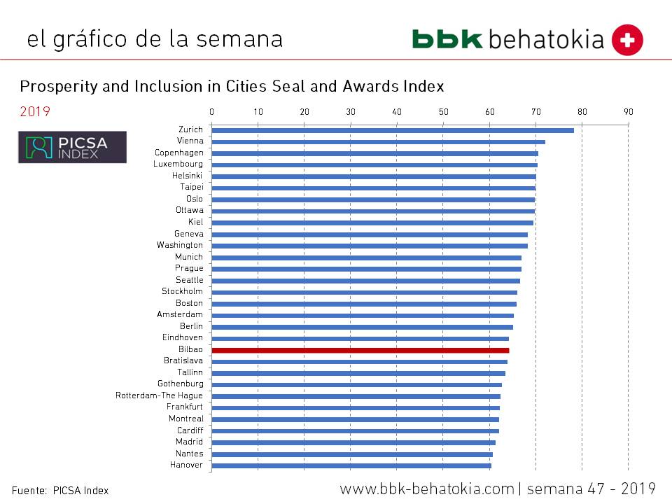 Esta semana se ha hecho público el índice PICSA (Prosperity & Inclusion City Seal and Awards) es una iniciativa conjunta de INSEAD, la Diputación Foral de Bizkaia y el Ayuntamiento de Bilbao y está elaborado por D&L Partners. Su objetivo es medir la riqueza de las ciudades no sólo en base a su crecimiento económico, sino también a la calidad y distribución del bienestar.