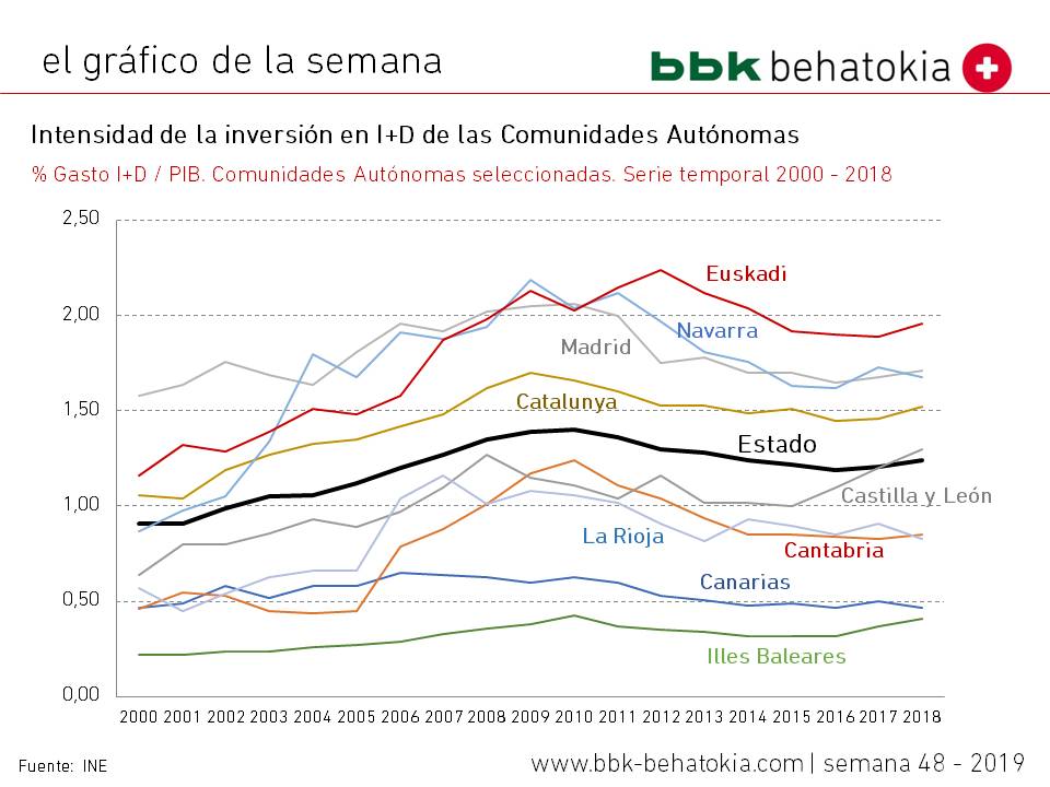 Bajando al detalle territorial, se constata que el 45,8% del gasto total en I+D interna de la Comunidad se lleva a cabo en Bizkaia, el 42,5% en Gipuzkoa y el 11,7% en Álava. Sin embargo, hay que señalar que este gasto representa el 2,37% del PIB de Gipuzkoa, el 1,68% en el caso de Bizkaia y el 1,35% en el de Álava.